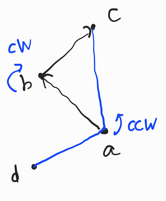 (a->b), (b->c)의 외적결과는 음수가된다. 시계방향이므로 오목한 도형이 되어 b는 정답이 되지 못하므로 정답배열에서 뺀다 d점은 a 의 바로 전 정답배열의 요소이다. ({... d, a, b} 순으로 정답배열이 만들어져 있었음)