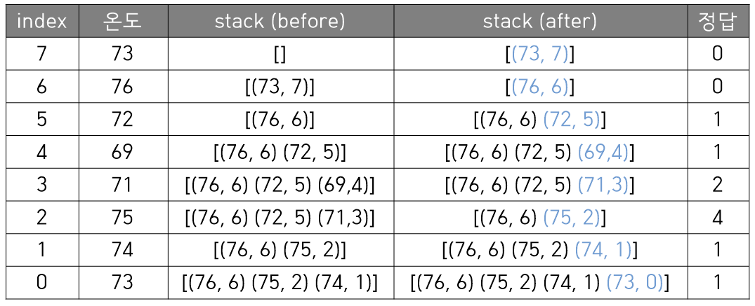 탐색하면서 만일 stack에 탐색 일자의 온도보다 높은 온도가 존재하지 않는다면 0, 존재한다면 stack의 top에 있는 온도의 인덱스에 현재 인덱스를 뺀 값을 정답 배열에 저장한다.