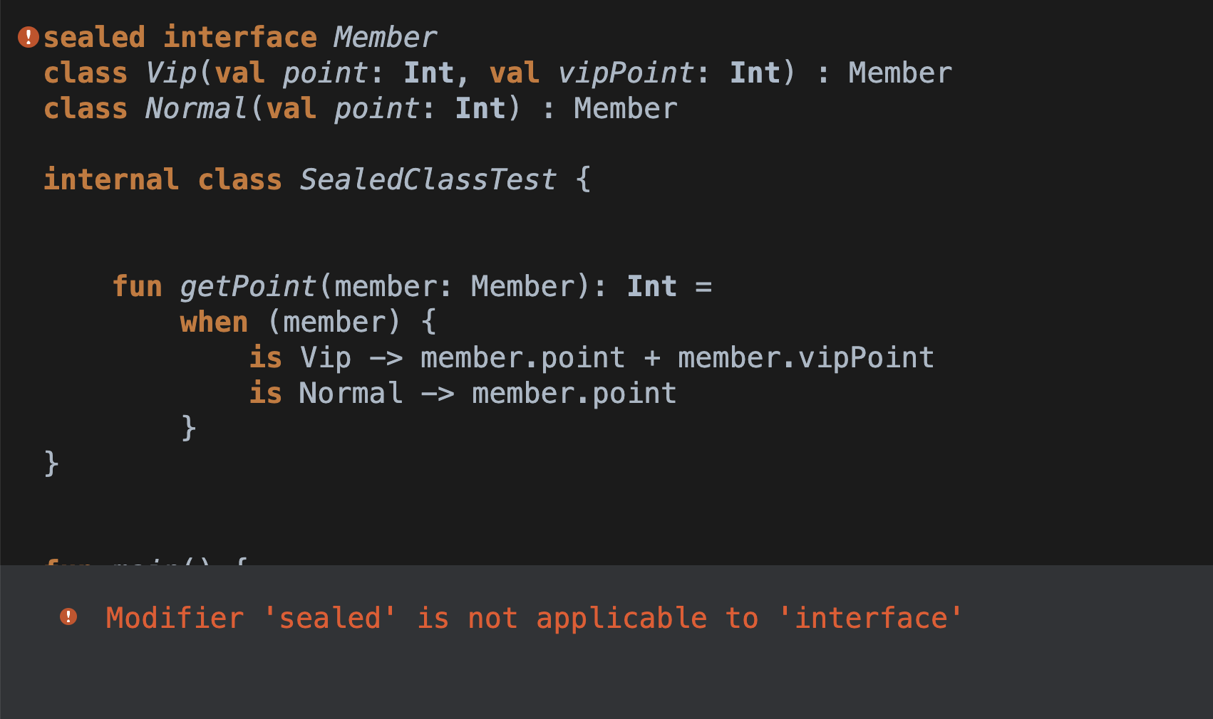 seled interface로 구현된 모든 클래스들의 타입은 컴파일러에게 전해지기 때문에 컴파일 단계에서 Vip, Normal 이 외의 타입은 존재하지 않음을 컴파일러가 알 수 있습니다.