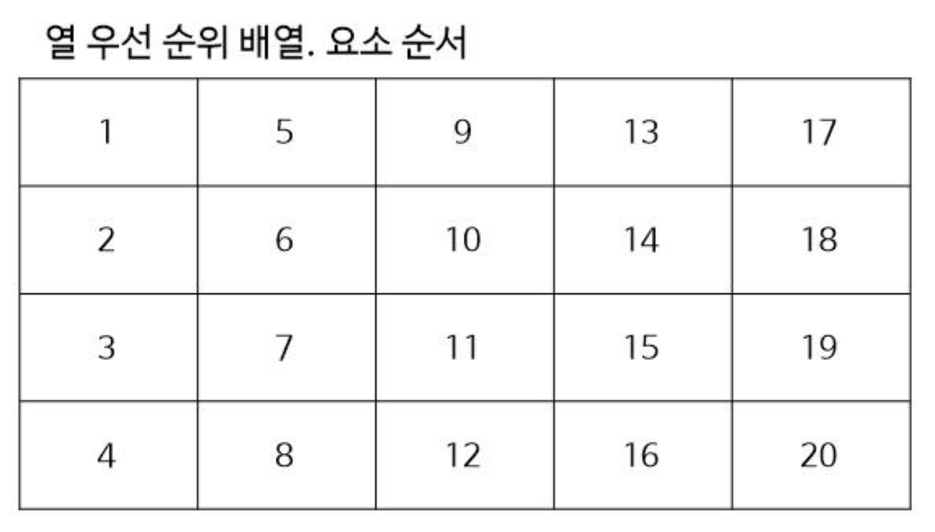 행 우선 방식에서는 1행에 해당하는 요소들을 모두 채우고 2행을 채운다고 하면 열 우선 방식에서는 1열에 해당하는 요소(1행 1열, 2행 1열, 3행 1열, 4행 1열)을 모두 채운 뒤 2열(1행 1열, 2행 1열, 3행 2열, 4행 2열)을 채우는 식으로 배열을 채워나갑니다.