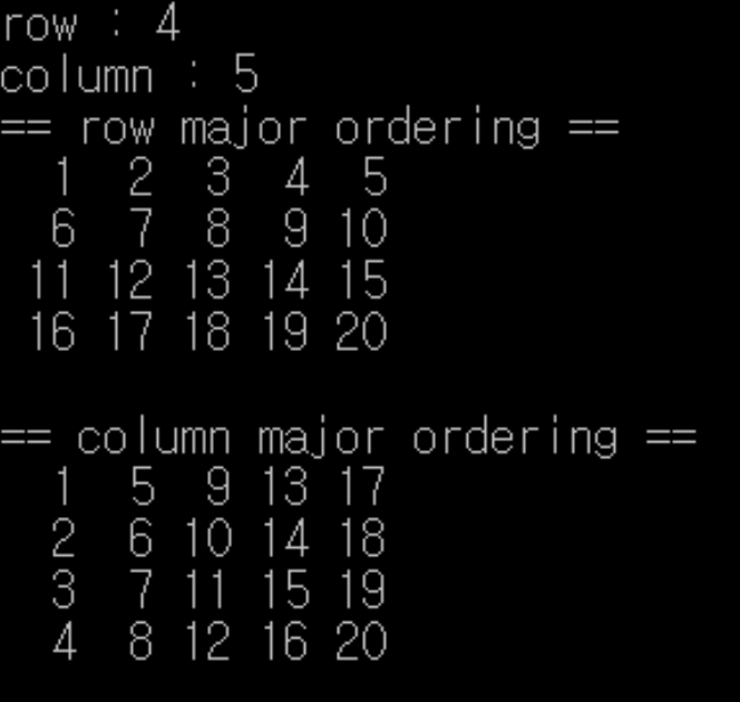 간단하게 행과 열의 크기를 입력받으면 행 우선 배열과 열 우선 배열에서 요소가 어떤 순서로 저장되는지 보여주는 소스코드를 작성해 보았습니다. 참고해주세요^^