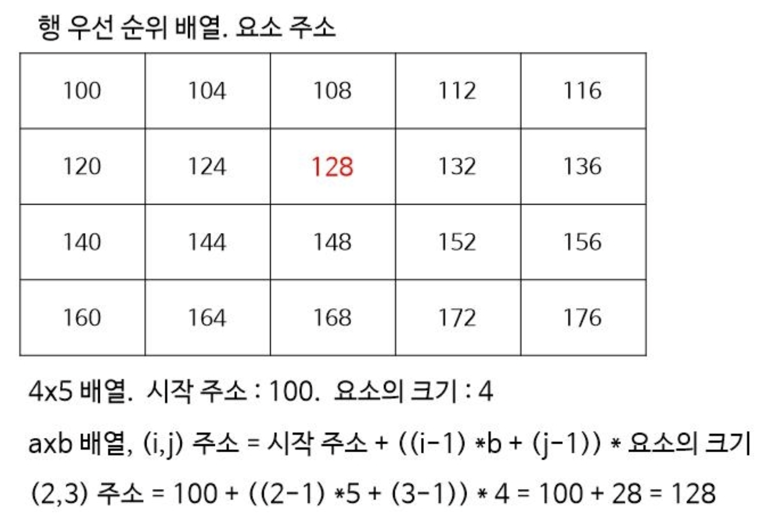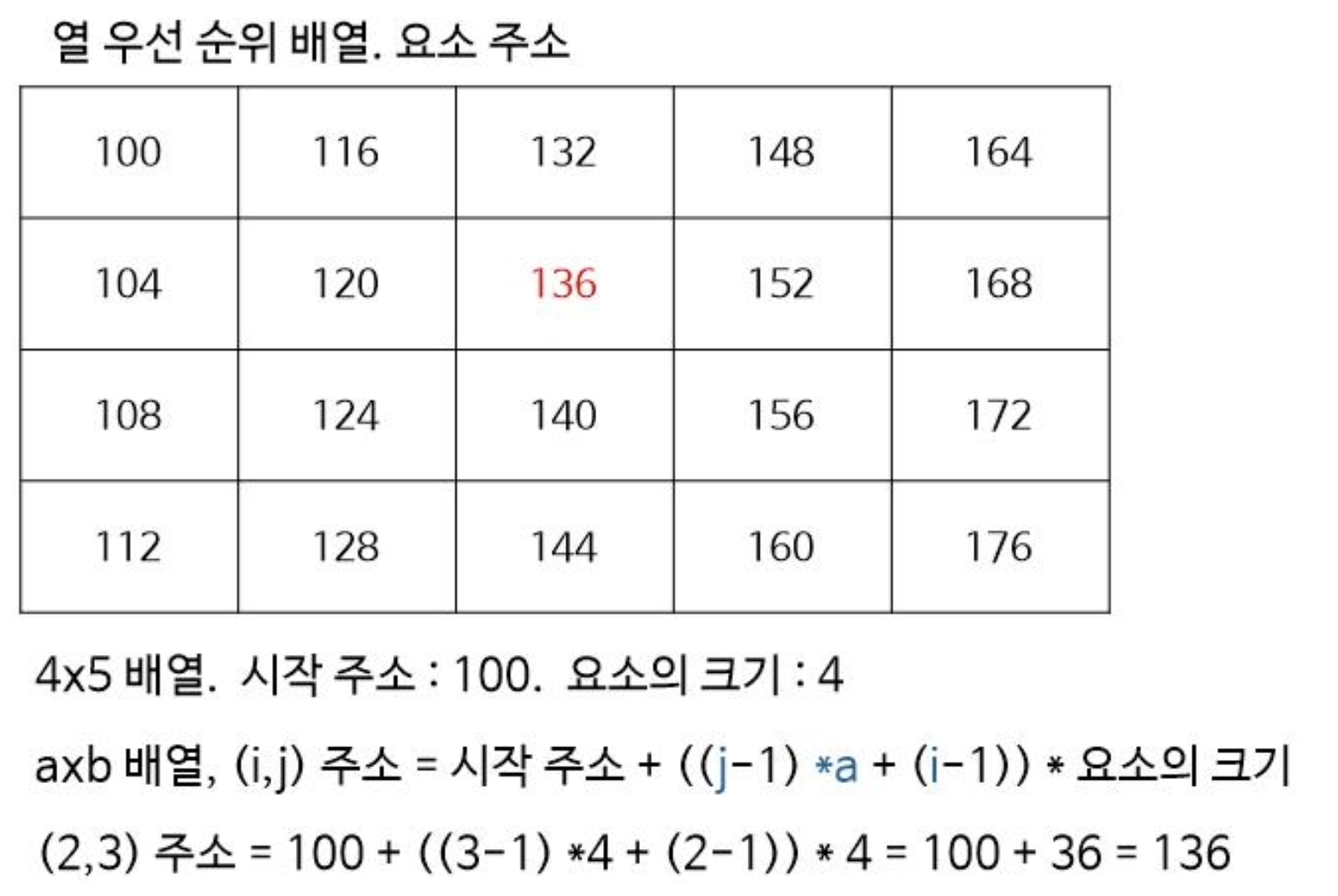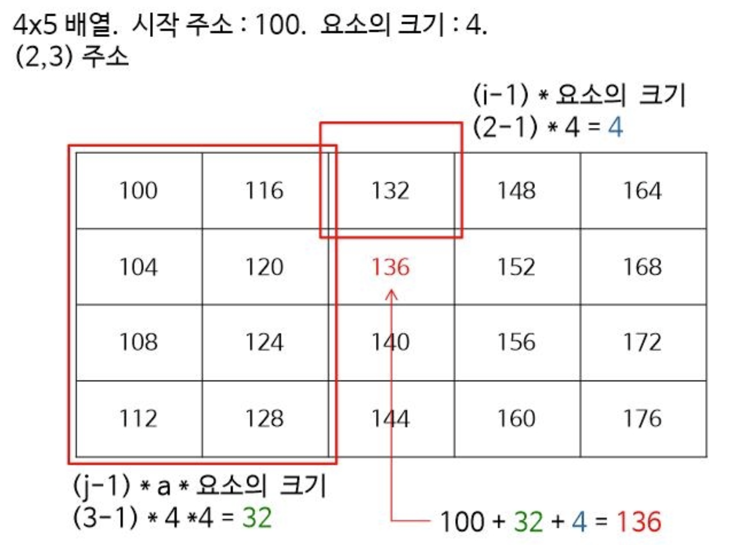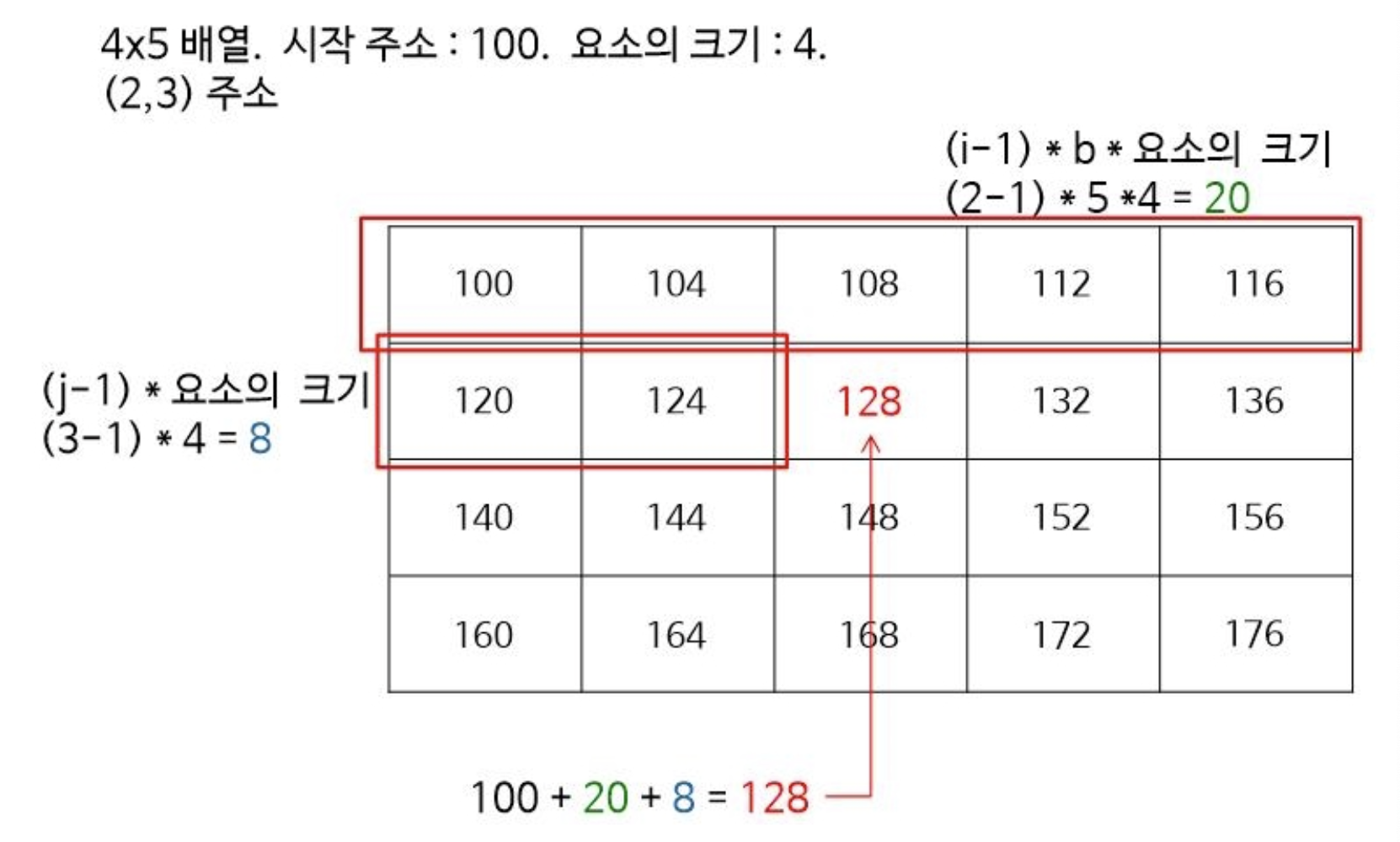 예를 들어서 보면 시작주소가 100이고 요소의 크기가 4인 4x5 배열에서 (2,3)의 주소는
