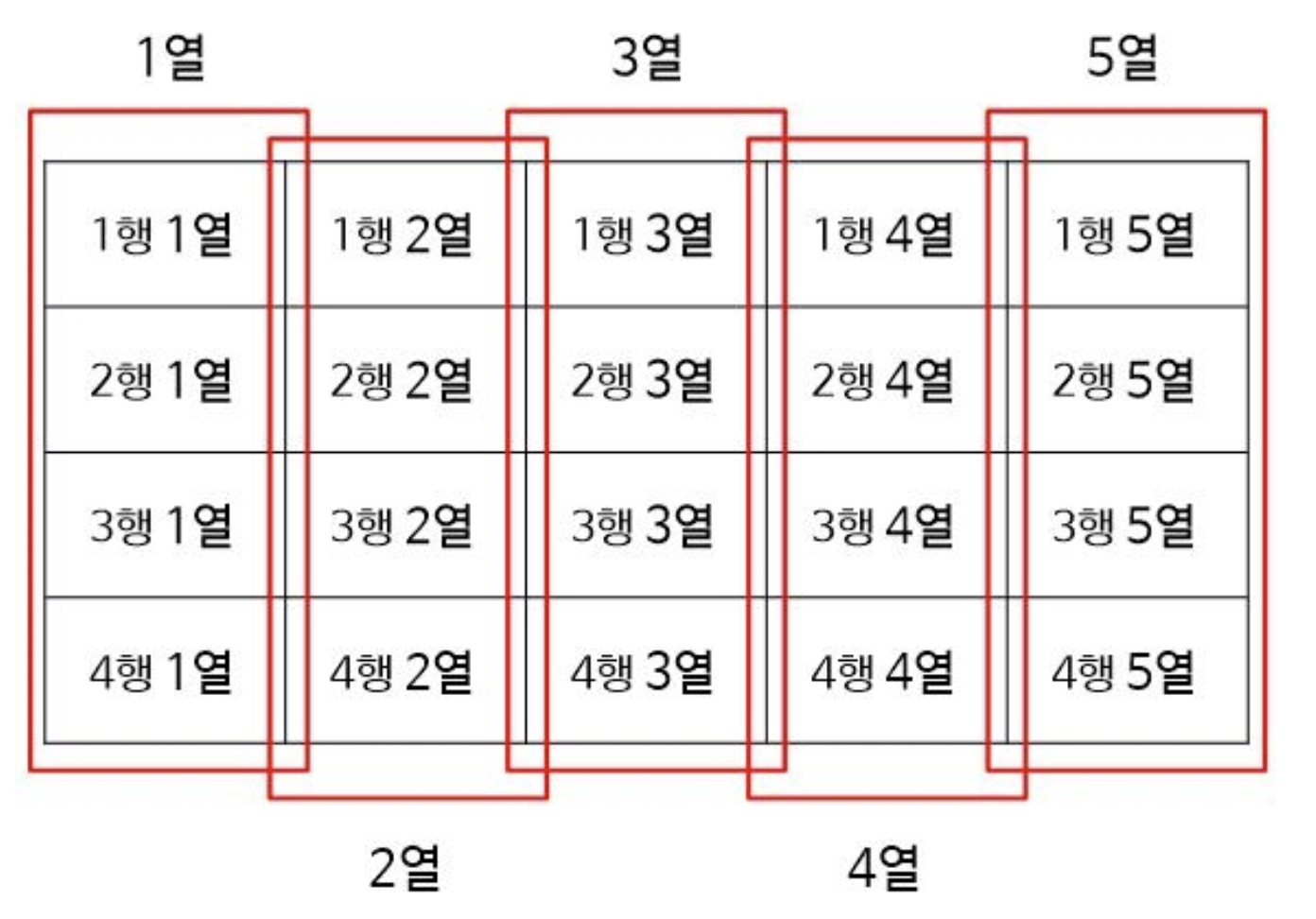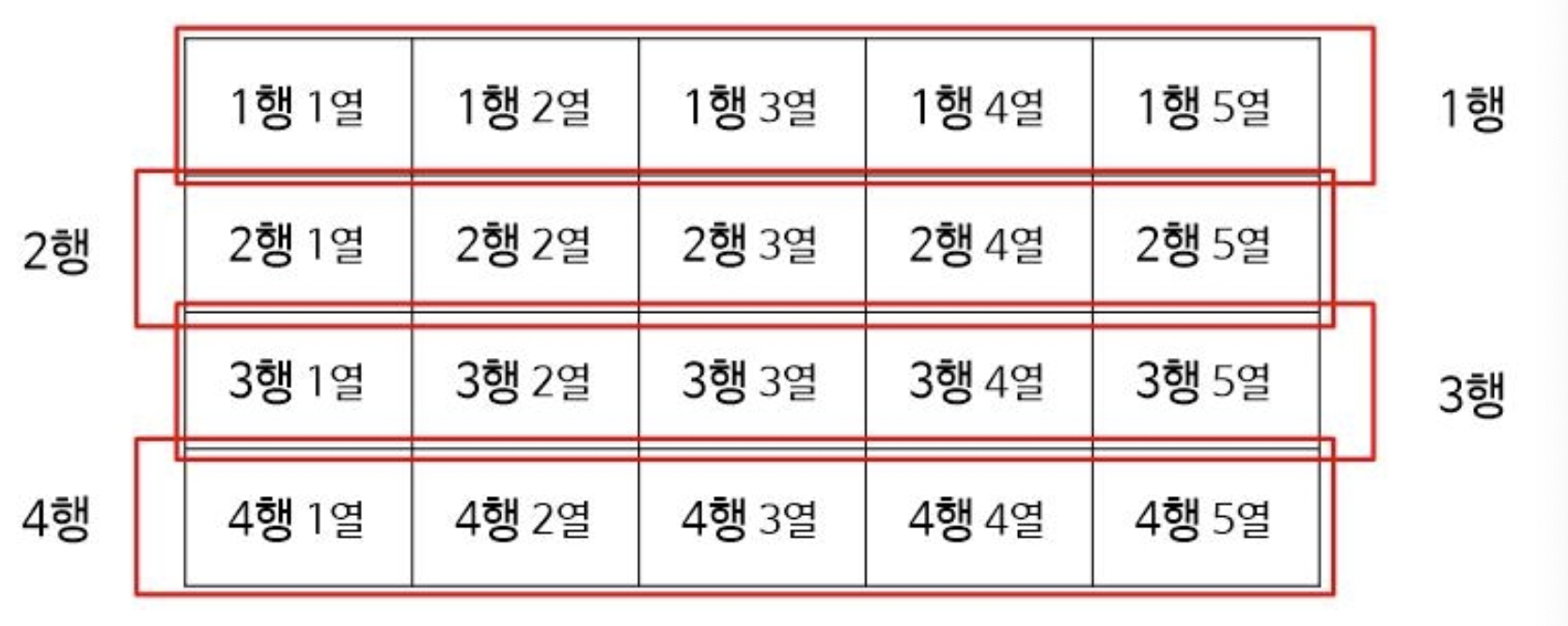 위의 그림에서 각 행들에 속하는 요소들을 빨간색 네모로 묶어보았는데 저 빨간색 네모를 먼저 채우고 다음 네모를 채운다고 생각하시면 됩니다.