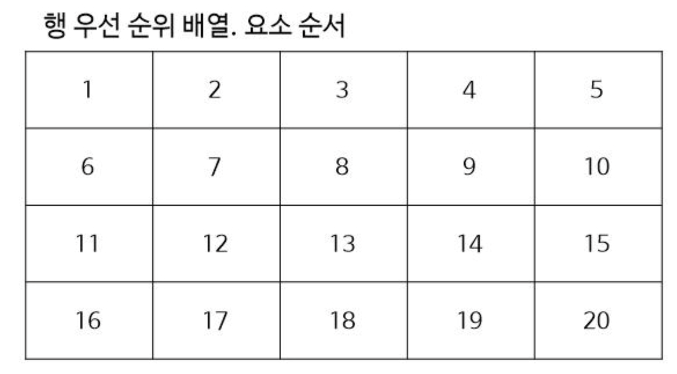 열 우선 방식으로 배열을 채워나가면 배열에 저장되는 요소들의 순서는 위와 같습니다.