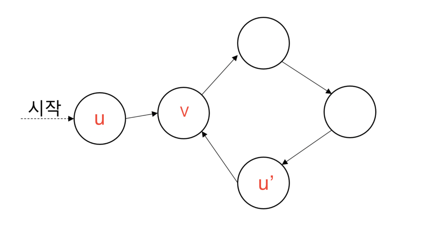 이번엔 위 로직을 돌려서 slow와 fast가 동일해졌을 때의, slow, fast 가 순환의 시작점이 되는 지점, v가 된다.