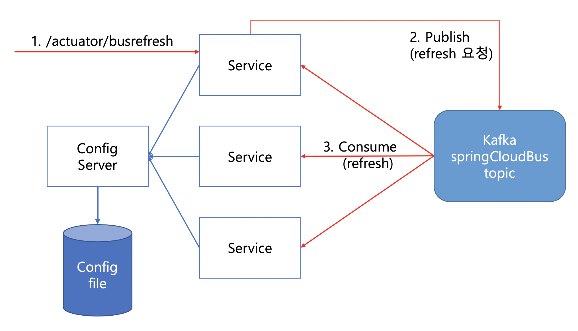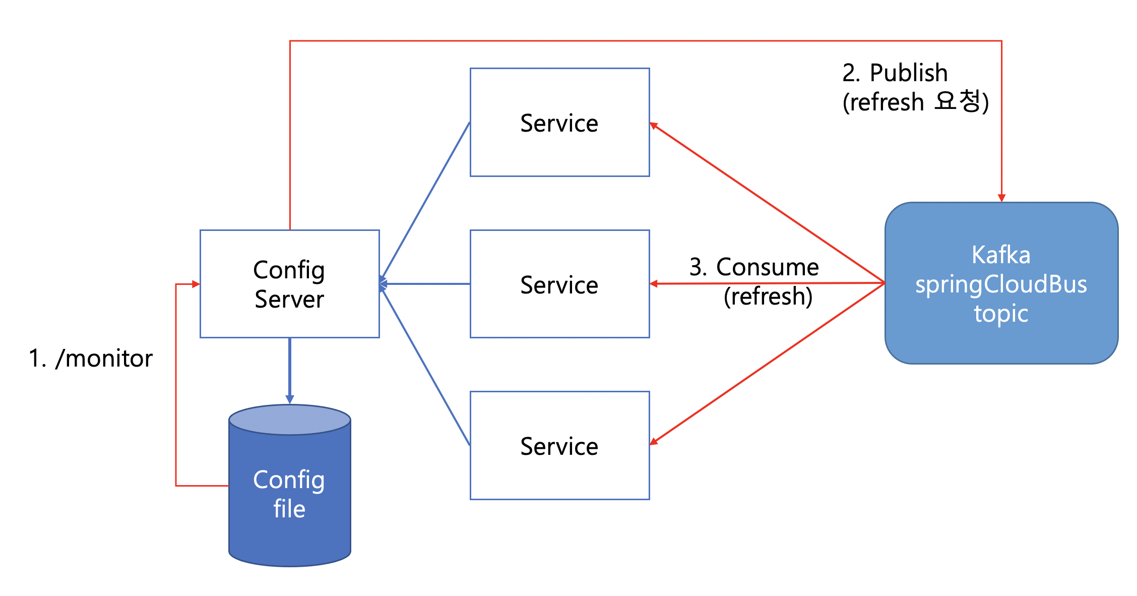 [그림 2]에서 어느 서비스 인스턴스에 /actuator/busrefresh 호출을 하면 설정해둔 카프카의 토픽에 publish 합니다.