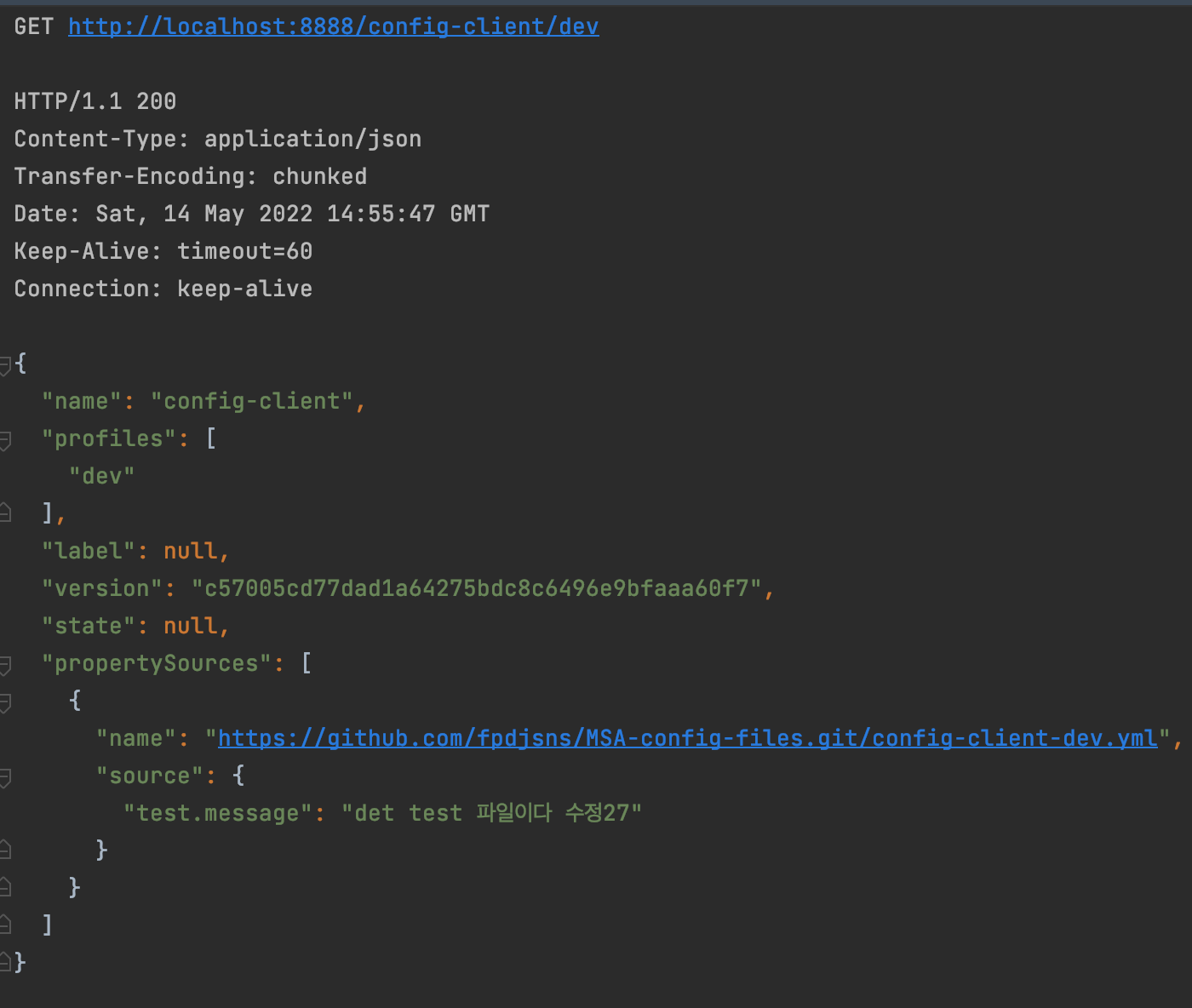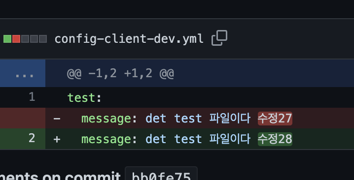 실제로 깃헙 웹훅을 등록한 뒤 config file 레포의 config-client-dev.yml을 바꿔보셔도 되고 위 요청을 호출해보셔도 됩니다.