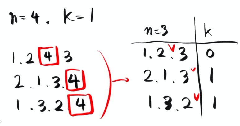 여기에서 추론 가능한건 n-1 크기의 배열에서 추가되는 4의 위치에 따라 k(inverse pairs)의 크기가 달라진다는 것이다.
