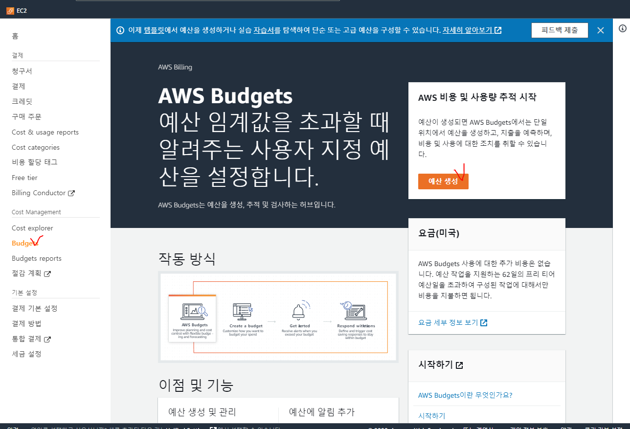 알람 지표에서 결제 알림을 선택하기 위해서는 billing 설정에서 "결제 알림 받기"를 활성해 주어야 한다.