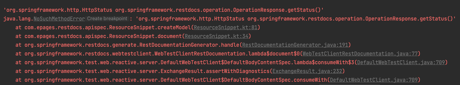 이번에는 java.lang.NoSuchMethodError: 'org.springframework.http.HttpStatus org.springframework.restdocs.operation.OperationResponse.getStatus()' 에러가 발생했습니다.