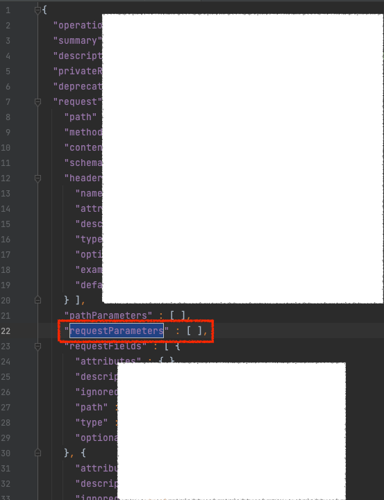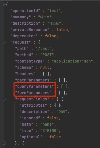 테스트 빌드 결과물로 직접 확인해보았습니다. 확인해보니 requestParameters는 없고 파라미터 관련 정보는 queryParameters, formParameters가 있었습니다.