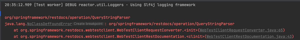 문서 테스트 코드는 동일하게 두고 테스트를 돌리면 위와 같이 java.lang.NoClassDefFoundError: org/springframework/restdocs/operation/QueryStringParser 에러가 발생하였습니다.