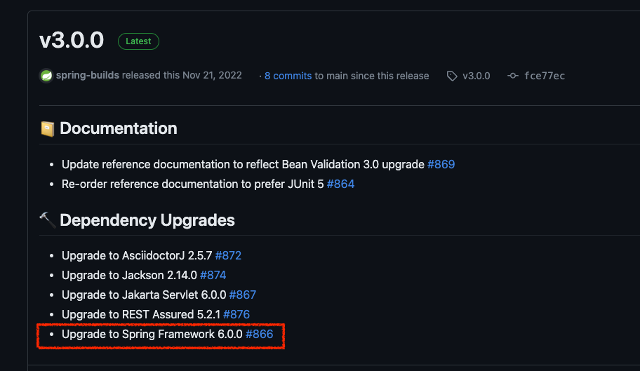 spring-restdocs 3.0.0 버전의 dependecy 정보를 보면 스프링 프레임워크의 의존성이 6으로 올라간 것을 확인할 수 있습니다.
