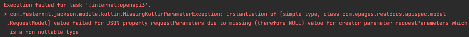 com.fasterxml.jackson.module.kotlin.MissingKotlinParameterException: Instantiation of [simple type, class com.epages.restdocs.apispec.model.RequestModel] value failed for JSON property requestParameters due to missing (therefore NULL) value for creator parameter requestParameters which is a non-nullable type