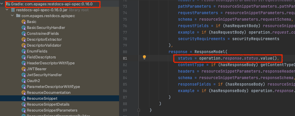 마지막 호출부분으로 찍힌 ResourceSnippet.kt:81 번째 줄을 확인해보니 com.epages:restdocs-api-spec:0.16.0 이 문제인 것 같았습니다.