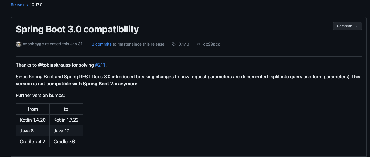 제목부터가 스프링 부트 3.0 호환성이네요. 마찬가지로 해당 버전으로 업데이트 해주었습니다.