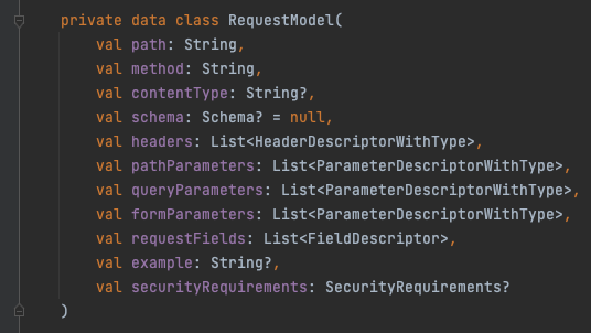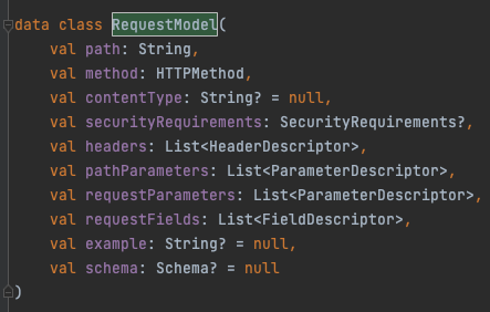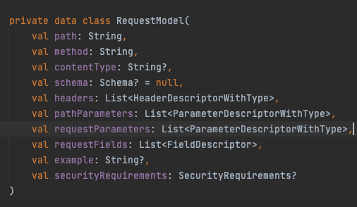 왼쪽이 restdocs-api-spec:0.17.1의 RequestModel이고 오른쪽이 0.16.0 버전의 RequestModel입니다.