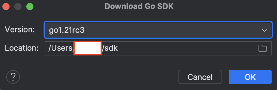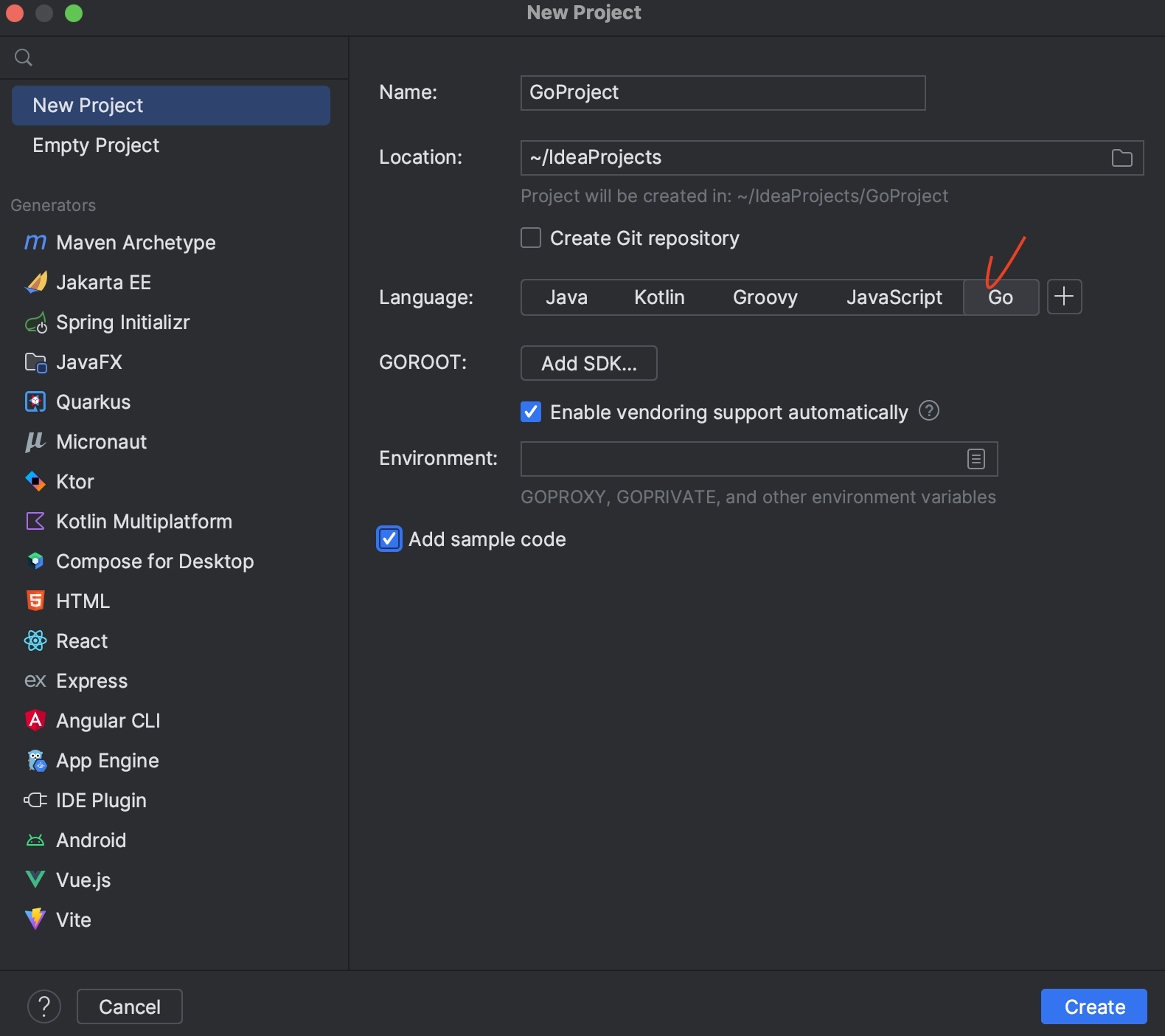 새로운 프로젝트 생성시 Go 언어 선택하고, 저는 SDK를 따로 설치하지 않아서