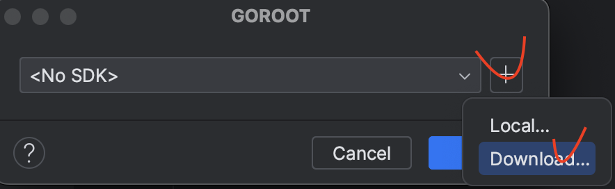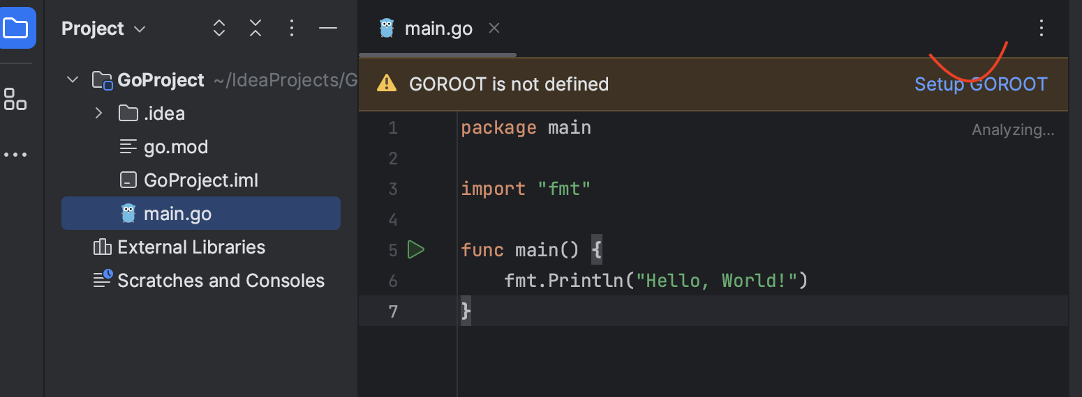 지금은 sdk가 없기 때문에 Setup GOROOT를 클릭해서 sdk를 설정하러 가줍시다.