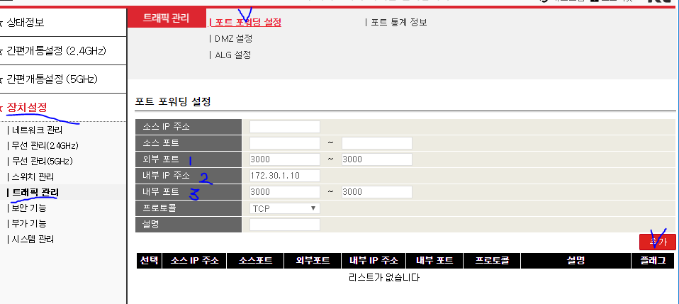 장치설정 > 트래픽 관리 > 포트 포워딩 설정