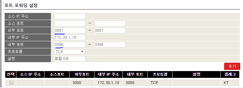 나는 외부에서 내부 db 서버로 접속할 수 있게하기 위해 외부 포트 3001로 접근시 내부 로컬 db 포트인 3306으로 포워딩 되게 추가 설정했다.