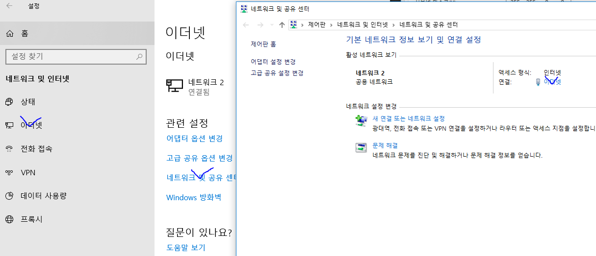 이더넷 > 네트워크 및 공유 센터 > 이더넷